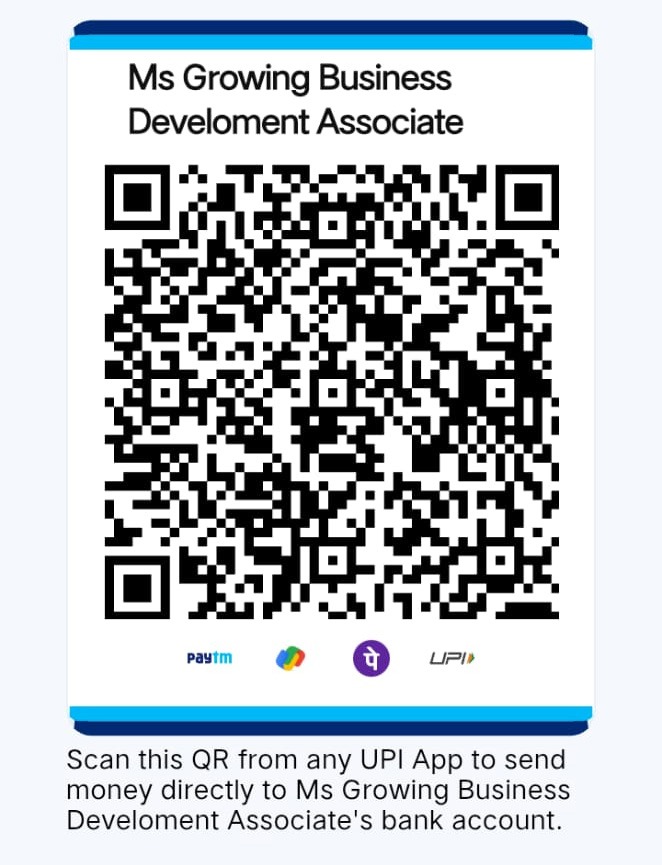 विशेष सूचना: ऊपर दिए गए आधिकारिक QR कोड के अतिरिक्त किसी भी अन्य माध्यम, व्यक्ति या अन्य खाते में किया गया भुगतान अमान्य माना जाएगा। ऐसे किसी भी अनाधिकृत लेनदेन के लिए संस्था (Growing Business Devlopment Associate) की कोई जिम्मेदारी नहीं होगी।"